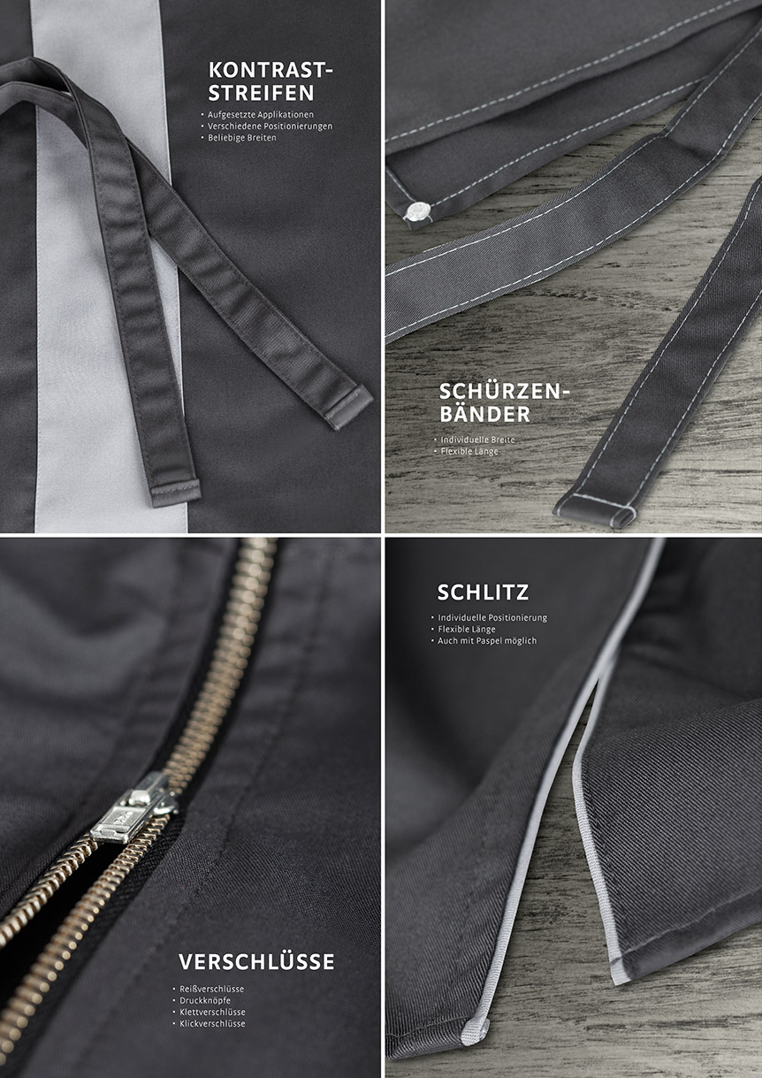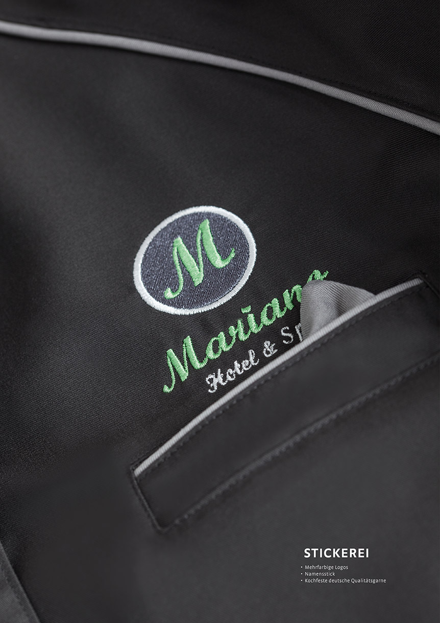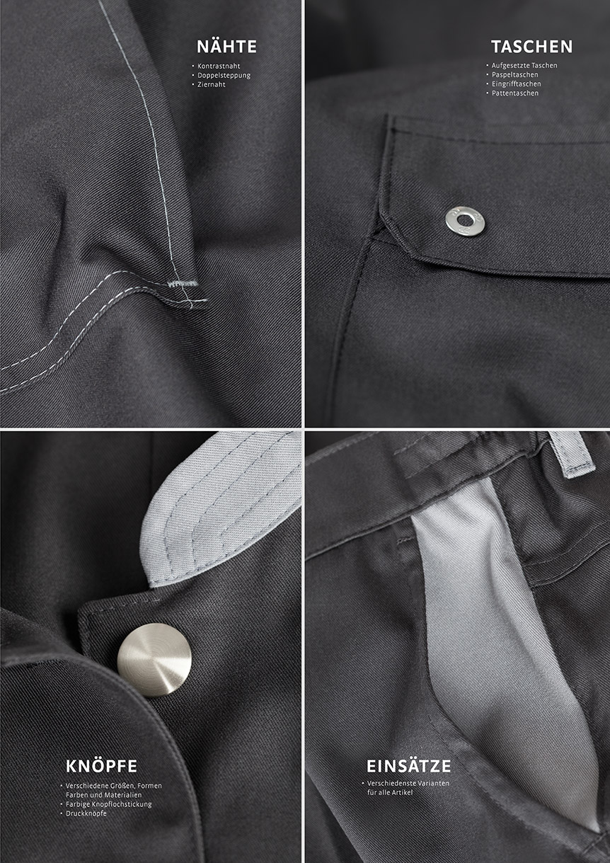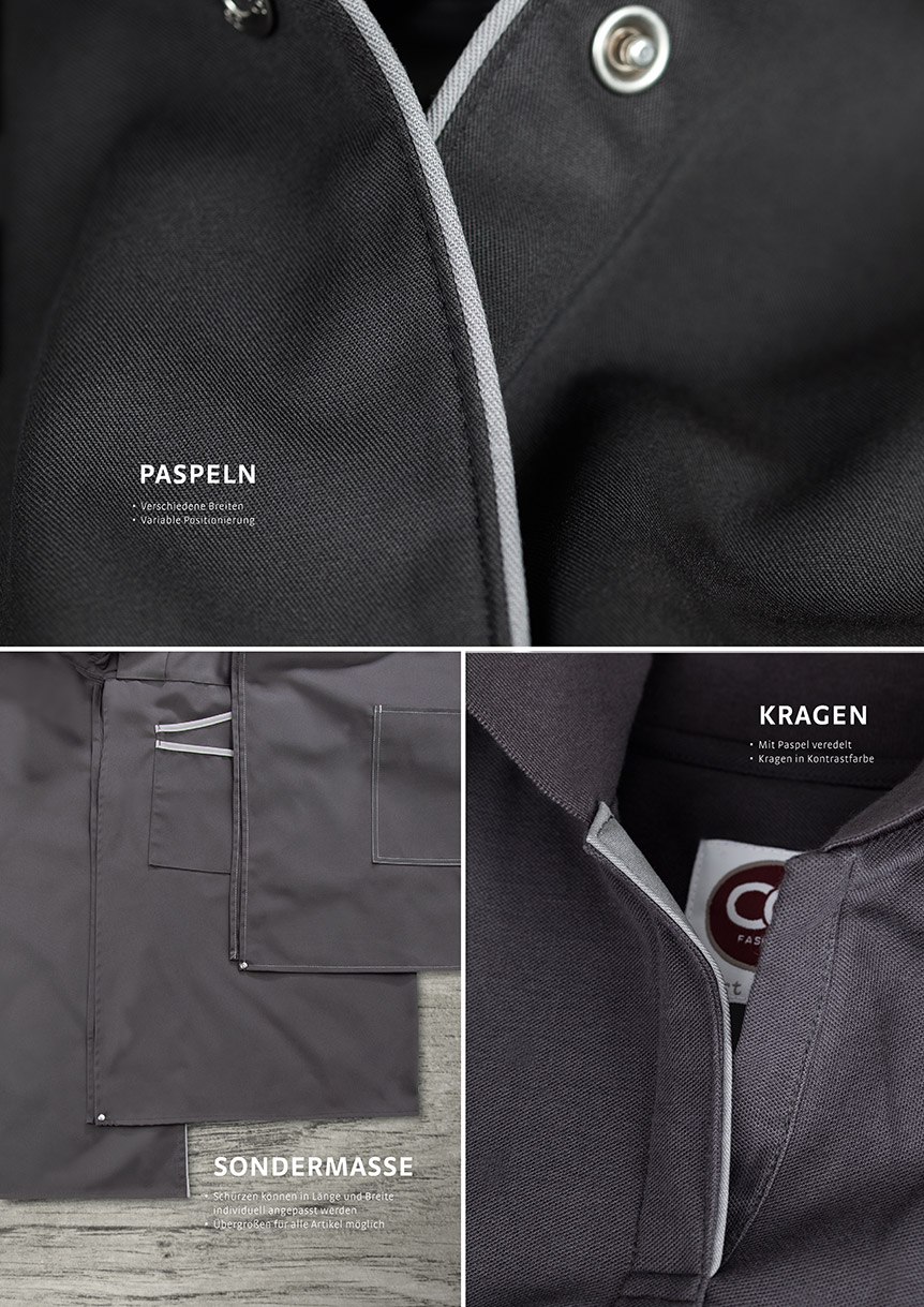 Zahlreiche Veredelungsmöglichkeiten garantieren Ihnen absolute Individualität. Mit farbigen Paspeln oder Biesen, Kontrastnähten, Taschen in verschiedensten Varianten und Ihrer Logostickerei entsteht eine einzigartige Kollektion, durch die Sie sich differenzieren und Ihre Einzigartigkeit wirkungsvoll unterstreichen können.